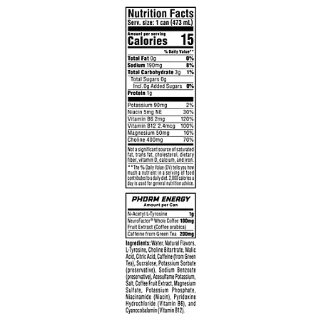 Water, Natural Flavors, L-Tyrosine, Choline Bitartrate, Malic Acid, Citric Acid, Caffeine (from Green Tea), Sucralose, Potassium Sorbate (preservative), Sodium Benzoate (preservative), Acesulfame Potassium, Salt, Coffee Fruit Extract, Magnesium Sulfate, Potassium Phosphate, Niacinamide (Niacin), Pyridoxine Hydrochloride (Vitamin B6), and Cyanocobalamin (Vitamin B12).