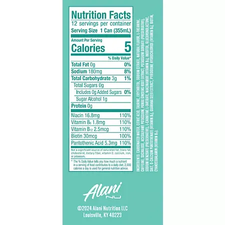 Carbonated Water, Citric Acid, Taurine, Erythritol, Sodium Citrate, Natural Flavor, L-theanine, Caffeine, Sucralose, Acesulfame Potassium, Panax Ginseng Root Extract, Potassium Sorbate (Preservative), Sodium Benzoate (Preservative), L-Carnitine L-tartrate, Niacinamide (Vitamin B3), Inositol, Glucuronolactone, Salt, D-Calcium Pantothenate (Vitamin B5), Guarana Seed Extract, Pyridoxine Hydrochloride (Vitamin B6), Biotin, Cyanocobalamin (Vitamin B12).