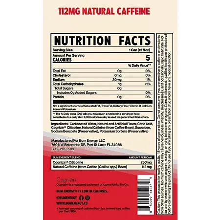 Carbonated Water, Natural Flavor, Citric Acid, Cognizin Citicoline, Natural Caffeine (from Coffee Bean), Sucralose, Sodium Benzoate (Preservative), Potassium Sorbate (Preservative).
