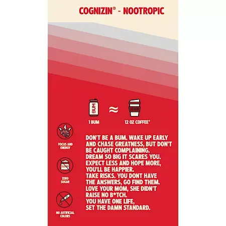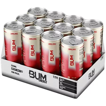 BUM Energy Cherry Frost is a zero-sugar, low-calorie carbonated energy drink designed to help you feel alert and focused without the jitters of high-stimulant beverages. Each 12 fl oz can delivers 112 mg of natural caffeine (about the same as a standard cup of coffee) sourced from coffee beans, plus Cognizin® citicoline, a nootropic ingredient that supports mental focus and clarity. Lightly refreshing with a crisp cherry flavor, this drink fits into active, on-the-go lifestyles and can be enjoyed anytime you need a boost.