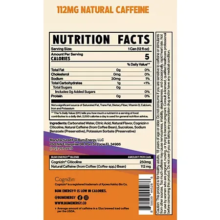 Carbonated Water, Citric Acid, Natural Flavor, Cognizin Citicoline, Natural Caffeine (from Coffee Bean), Sucralose, Sodium Benzoate (Preservative), Potassium Sorbate (Preservative).
