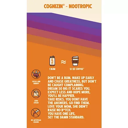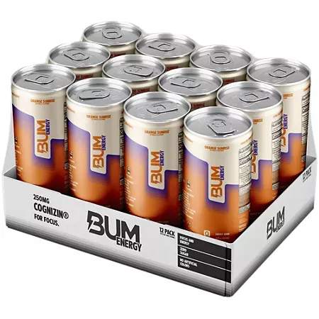 BUM Energy Orange Sunrise is a refreshing, lightly carbonated energy drink designed to support focus and clean energy. Each can delivers 112 mg of caffeine sourced to provide a smooth boost without the crash. It is sugar-free, low calorie, and formulated without artificial colors, making it a smart choice for busy days, workouts, or anytime you need an energy lift. The bright orange citrus flavor offers a crisp and enjoyable taste.