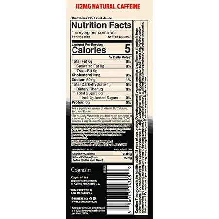 Carbonated Water, Natural and Artificial Flavor, Cognizin Citicoline, Phosphoric Acid, Natural Caffeine (from Coffee Bean), Sucralose, Sodium Benzoate (Preservative), Potassium Sorbate (Preservative).