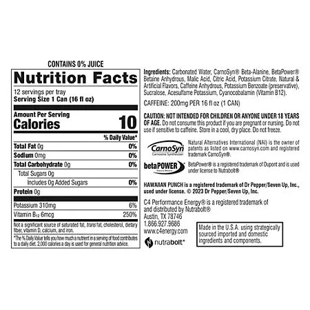 This C4 Performance Energy drink delivers zero sugar and punchy Hawaiian Punch™ Fruit Juicy Red flavor in a carbonated energy drink format. It’s designed to support energy, performance, and endurance with a blend that includes CarnoSyn® Beta-Alanine (known to enhance muscular endurance), BetaPower® betaine (helps support hydration and physical performance), and 200 mg of caffeine per can for a powerful energy boost. This energizing beverage is ideal for anyone needing an extra kick during workouts or long days.