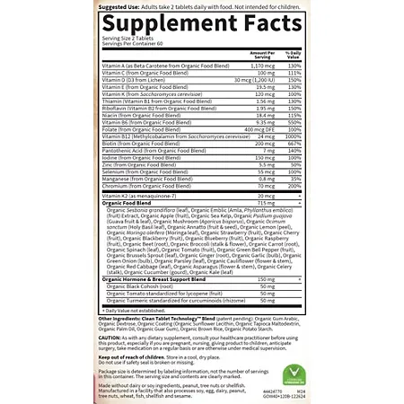 Made from over 30 organic fruits, vegetables, and herbs, this whole-food-based multivitamin delivers clean, nutrient-rich support for overall well-being. It contains essential vitamins and minerals such as Vitamins A, C, D3, and Zinc to help meet daily nutritional needs. This vegan multivitamin is non-GMO, gluten-free, and free from artificial colors, flavors, and preservatives.