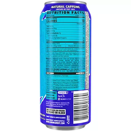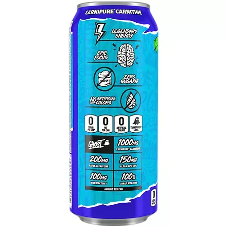 Ghost Energy Blue Raspberry is a refreshing, zero-sugar energy drink designed to fuel your day with focused energy and great taste. Each 16 fl oz can delivers 200 mg of natural caffeine sourced from coffee bean extract to help boost alertness and stamina, making it ideal for workouts, busy days, or whenever you need a clean lift. The formula includes a blend of key performance-supporting ingredients like Carnipure® L-Carnitine, Taurine, Alpha-GPC for cognitive support, and Neurofactor™ coffee fruit extract. A full spectrum of essential B-vitamins (B3, B6, B12) plus Vitamin C supports energy metabolism and overall vitality. Ghost Energy is gluten-free, vegan, and contains no artificial colors, offering a transparent-label option for energy lovers who want to know exactly what they’re consuming.