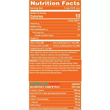 Carbonated Filtered Water, Erythritol, Citric Acid, Natural Flavors, N-Acetyl-L-Tyrosine, Alpha-GPC 50% (L-alpha-glycerylphosphorylcholine), Caffeine Anhydrous, Uridine 5′-Monophosphate, Sucralose, Sodium Benzoate, Potassium Sorbate, Gum Acacia, L-Theanine, Ascorbic Acid, Acesulfame Potassium, Niacinamide, Saffron Extract, Edetate Calcium Pantothenate, Pyridoxal 5′-Phosphate, Methylcobalamin, Huperzine A (from Huperzia serrata whole plant extract).