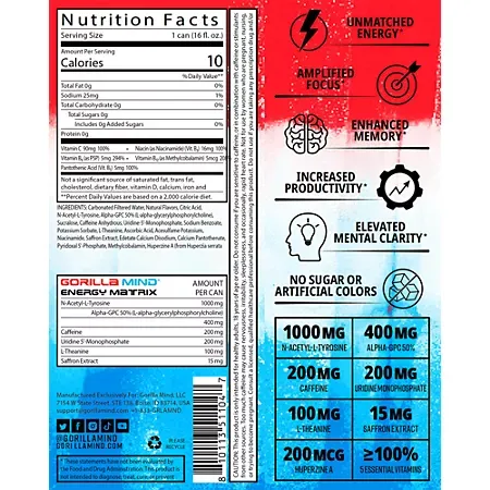 Carbonated Filtered Water, Erythritol, Citric Acid, Natural Flavors, N-Acetyl-L-Tyrosine, Alpha-GPC 50% (L-alpha-glycerylphosphorylcholine), Caffeine Anhydrous, Uridine 5′-Monophosphate, Sucralose, Sodium Benzoate, Potassium Sorbate, Gum Acacia, L-Theanine, Ascorbic Acid, Acesulfame Potassium, Niacinamide, Saffron Extract, Edetate Calcium Pantothenate, Pyridoxal 5′-Phosphate, Methylcobalamin, Huperzine A (from Huperzia serrata whole plant extract).