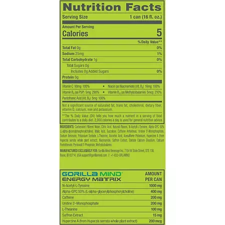Tap into a bold, sugar-free energy boost with Gorilla Mind Energy – Citrus Rain. Each 16 fl oz can is crafted to support energy, focus, memory, productivity and mental clarity with a targeted nootropic blend. The drink includes 1000 mg N-acetyl-L-tyrosine, 400 mg Alpha-GPC, 200 mg caffeine, 200 mg uridine monophosphate, 100 mg L-theanine, 15 mg saffron extract, 200 mcg Huperzine A and 5 essential vitamins in biologically active forms. Its vibrant citrus flavor delivers refreshing taste without added sugars or artificial colors, making it a versatile choice for busy days, workouts or long study sessions.