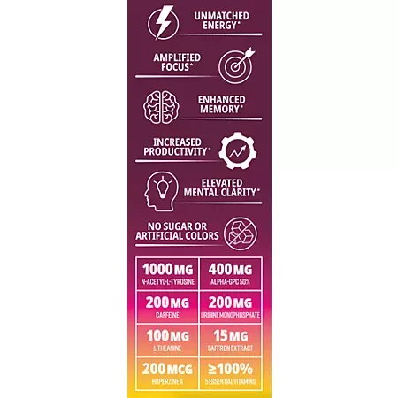 A high-performance energy drink designed to support energy, focus, memory, productivity, and mental clarity with a refreshing blackberry lemonade flavor. Each 16 fl oz can features a potent blend of N-Acetyl-L-Tyrosine, Alpha-GPC, caffeine, uridine monophosphate, l-theanine, saffron extract, Huperzine A, and 5 essential vitamins in active forms. This formula delivers clean, sugar-free energy with zero artificial colors and nearly zero calories, helping you stay sharp and energized throughout the day. Per can: approximately 200 mg of caffeine plus nootropics to help enhance cognitive performance and alertness.