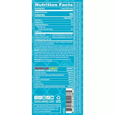 Carbonated Filtered Water, Citric Acid, N-Acetyl-L-Tyrosine, Natural Flavor, Alpha-GPC 50% (L-alpha-glycerylphosphorylcholine), Sucralose, Sodium Citrate, Caffeine Anhydrous, Uridine 5′-Monophosphate, Acesulfame Potassium, Sodium Benzoate (preservative), Potassium Sorbate (preservative), Tartaric Acid, L-Theanine, Ascorbic Acid, Niacinamide, Saffron Extract, Edetate Calcium Disodium, Calcium Pantothenate, Pyridoxal 5′-Phosphate, Methylcobalamin, Huperzine A (from Huperzia serrata whole plant extract).