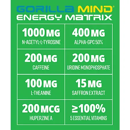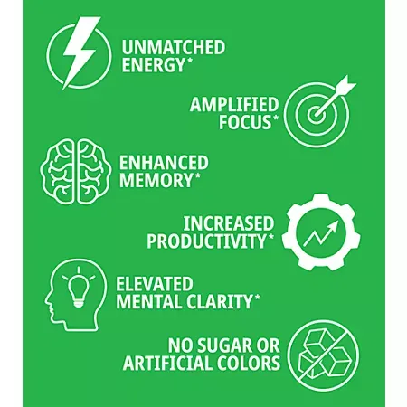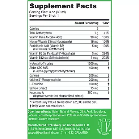 Supports fast-acting energy and focus with a sugar-free Exotic Kiwi flavor. This potent energy shot helps promote productivity, memory, and mental clarity. The formula includes 1,000mg of N-acetyl-L-tyrosine, 400mg of Alpha GPC, 200mg of caffeine, 200mg of uridine monophosphate, 100mg of L-theanine, 15mg of saffron extract, 200mcg of Huperzine A, and 5 essential vitamins in active forms to give you a balanced and energized boost.