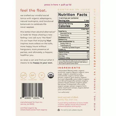 Hiyo is a USDA organic, non-alcoholic social tonic thoughtfully formulated with adaptogens and nootropics as a refreshing alternative to alcohol. Each can delivers a smooth, uplifting feeling—often called “the float”—powered by naturally sourced functional ingredients such as ashwagandha, L-theanine, lion’s mane, cordyceps, ginger, and turmeric. Hiyo comes in three vibrant, fruit-inspired flavors: Peach Mango, Watermelon Lime, and Blackberry Lemon. Designed for mindful unwinding, this tonic supports relaxed social moments without compromising wellness. With only 30 calories and 0% ABV per can, it offers a flavorful way to enjoy gatherings, stay present, and feel great—no hangovers required.