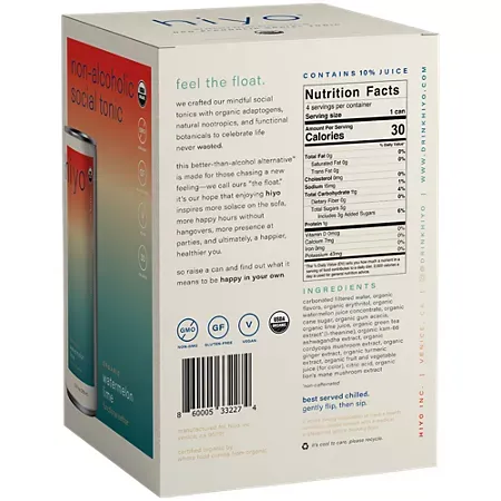 Carbonated Filtered Water, Organic Flavors, Organic Erythritol, Organic Watermelon Juice Concentrate, Organic Cane Sugar, Organic Gum Acacia, Organic Lime Juice, Organic Green Tea Extra* (L-Theanine), Organic Ksm-66 Ashwagandha Extract, Organic Cordyceps Mushroom Extract, Organic Ginger Extract, Organic Turmeric Extract, Organic Fruit and Vegetable Juice (For Color), Citric Acid, Organic Lion’s Mane Mushroom Extract