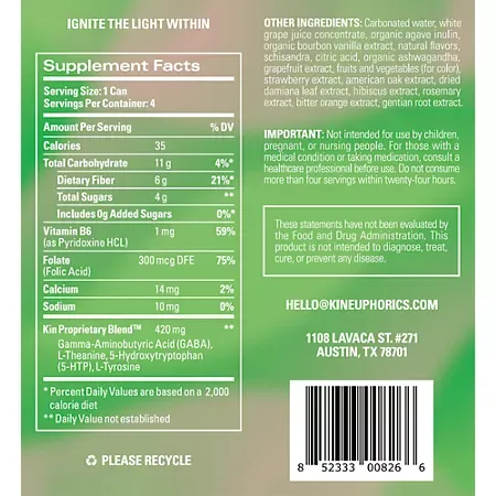| KIN PROPRIETARY BLEND – GAMMA-AMINOBUTYRIC ACID (GABA), L-THEANINE, 5-HYDROXYTRYPTOPHAN (5-HTP), L-TYROSINE | 420 MG | **% |