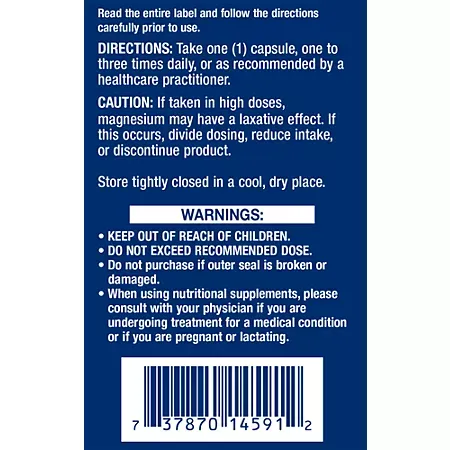 High doses of magnesium may cause a laxative effect. If this occurs, reduce dosage, divide servings, or discontinue use. Store tightly closed in a cool, dry place. Consult your physician before use if you are pregnant, nursing, or under medical care. Keep out of reach of children. Do not exceed the recommended dose. Do not use if the safety seal is broken or damaged.