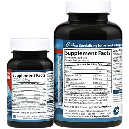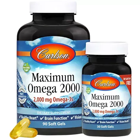 Maximum Omega 2000 delivers a powerful 2,000 mg of omega-3s per serving, including 1,250 mg of EPA and 500 mg of DHA to support heart, brain, vision, and joint health. To ensure exceptional quality, Maximum Omega 2000 is carefully managed from sea to store. The fish are sustainably sourced from deep, cold waters and processed at a highly regulated facility for purification. Each softgel is encapsulated and tested by an FDA-registered laboratory to guarantee freshness, potency, and purity. Support optimal health with the essential omega-3s your body needs using Carlson Maximum Omega 2000.