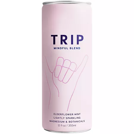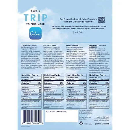 Elderflower Mint: Carbonated water, fruit juices from concentrate (26%) (apple, grapefruit) natural flavors and botanical extracts (elderflower, mint, lemon balm, chamomile, ginseng), citric acid, flavor enhancer (erythritol), natural sweetener (stevia), TRIP Mindful Blend (magnesium citrate, lion’s mane extract, ashwagandha root extract, L-theanine). Cucumber Mint: Carbonated water, fruit juices from concentrate (23%) (grape, apple, cucumber (2%)) natural flavors and botanical extracts (spearmint, lemon balm, chamomile, ginseng), citric acid, flavor enhancer (erythritol), natural sweetener (stevia), TRIP Mindful Blend (magnesium citrate, lion’s mane extract, ashwagandha root extract, L-theanine). Peach Ginger: Carbonated water, fruit juices from concentrate (23%) (peach 20%, passionfruit) natural flavors and botanical extracts (ginger, ginseng, turmeric, lemon balm, chamomile), citric acid, flavor enhancer (erythritol), natural sweetener (stevia), TRIP Mindful Blend (magnesium citrate, lion’s mane extract, ashwagandha root extract, L-theanine). Raspberry Orange Blossom: Carbonated water, fruit juices from concentrate (28%) (apple, grape, guava, raspberry (2%)), apple cider vinegar, natural flavors and botanical extracts (lemon balm, chamomile, ginseng, orange blossom), citric acid, flavor enhancer (erythritol), natural sweetener (stevia), TRIP Mindful Blend (magnesium citrate, lion’s mane extract, ashwagandha root extract, L-theanine).