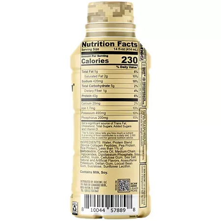 Water, Protein Blend (Bovine Collagen Peptides, Pea Protein, Rice Protein), Less than 1%: Maltodextrin, Canola Oil, Medium Chain Triglycerides, Dipotassium Phosphate, Soy Lecithin, Inulin, Cellulose Gum, Gellan Gum, Locust Bean Gum, Sucralose, Sunflower Lecithin. Contains: Milk, Soy.