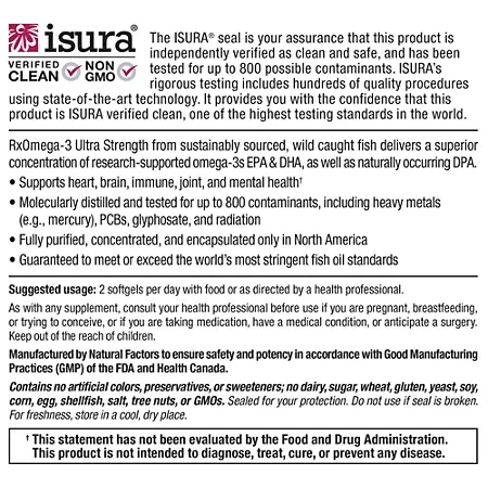 RxOmega-3 Ultra Strength delivers a superior concentration of research-supported omega-3 fatty acids, including EPA & DHA, plus naturally occurring DPA, sourced from sustainably harvested, wild-caught fish; Supports heart, brain, immune, joint, and mental health† Molecularly distilled and rigorously tested for up to 800 contaminants, including heavy metals (such as mercury), PCBs, glyphosate, and radiation; Fully purified, concentrated, and encapsulated exclusively in North America; Guaranteed to meet or exceed the world’s most stringent fish oil quality standards†