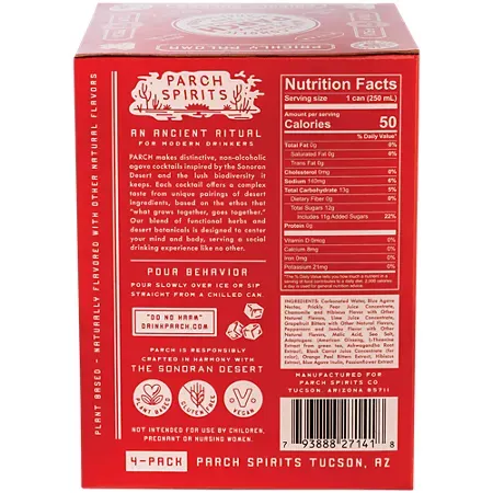 Carbonated Water, Blue Agave Nectar, Prickly Pear Juice Concentrate, Chamomile and Hibiscus Flavore with Other Natural Flavors, Lime Juice Concentrate, Grapefruit Bitters with Other Natural Flavors, Peppercorn and Jambu Flavor with Other Natural Flavors, Malic Acid, Sea Salt, Adaptogens (American Ginseng, L-Theanine Extract from Green Tea, Ashwagandha Root Extract), Black Carrot Juice Concentrate (for color), Orange Peel Bitters Extract, Hibiscus Extract, Blue Agave Inulin, Passionflower Extract.