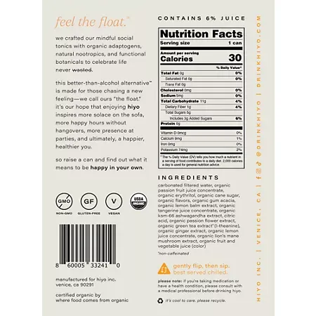 Carbonated filtered water, organic passion fruit juice concentrate, organic erythritol, organic cane sugar, organic flavors, organic gum acacia, organic lemon balm extract, organic tangerine juice concentrate, organic ksm-66 ashwagandha extract, citric acid, organic passion flower extract, organic green tea extract (l-theanine), organic ginger extract, organic lemon juice concentrate, organic lion’s mane mushroom extract, organic fruit and vegetable (color).