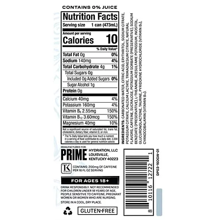 Prime Energy Original delivers a bold energy boost with 200 mg of caffeine per 16 fl oz can, designed to help you stay focused and alert whether you’re hitting the gym, grinding through work, or powering through a long day. It’s infused with electrolytes to support hydration and recovery, and enhanced with B-vitamins like B6 and B12 to help the body convert nutrients into usable energy. With zero grams of added sugar and a low-calorie profile, this drink offers stimulant support without extra calories or sweetness.