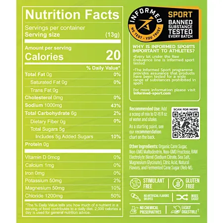 Organic Cane sugar, Non-GMO Maltodextrin, Non-GMO Fructose, RAW Electrolyte Blend (Sodium Citrate, Sea Salt, Magnesium Glycinate), Citric Acid, Natural Flavors, and Fermented Cane Sugar (Reb-M).