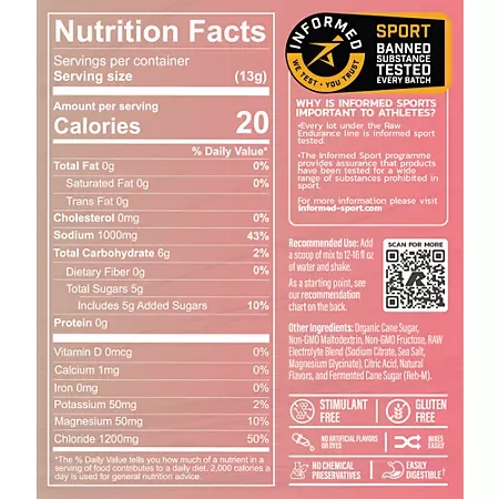 Organic Cane sugar, Non-GMO Maltodextrin, Non-GMO Fructose, RAW Electrolyte Blend (Sodium Citrate, Sea Salt, Magnesium Glycinate), Citric Acid, Natural Flavors, and Fermented Cane Sugar (Reb-M).