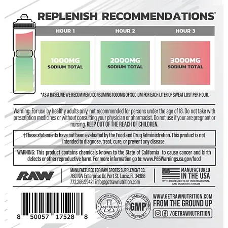 Advanced electrolyte recovery blend designed to support hydration, stamina, and peak performance. Helps replenish essential minerals lost during intense activity. Recommended sodium intake: Hour 1 – 1000 mg total, Hour 2 – 2000 mg total, Hour 3 – 3000 mg total.