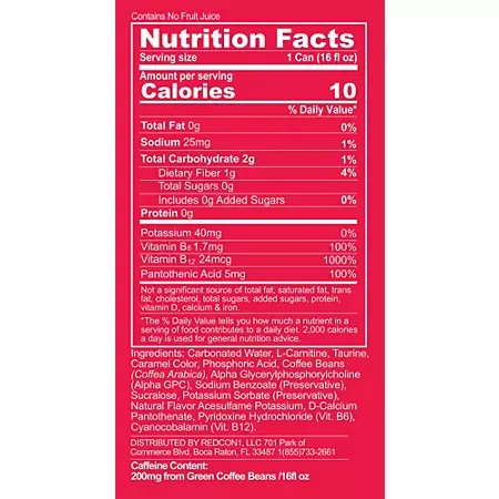 Carbonated Water, Citric Acid, L-Carnitine, Taurine, Caramel color, Phosphoric Acid, Coffee Beans (Coffea Arabica), Alpha Glycerylphosphorylcholine (Alpha GPC), Sodium Benzoate (preservative), Sucralose, Potassium Sorbate (preservative), Natural Flavor Acesulfame Potassium, D-Calcium Pantothenate, Pyridoxine Hydrochloride (Vit. B6), Cyanocobalamin (Vit. B12).
