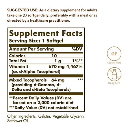 Vitamin E is an essential nutrient and the body’s primary fat-soluble antioxidant.† It helps support immune system function and protects cells from oxidative stress caused by free radicals.† This formula provides 670 mg of Vitamin E per serving, equivalent to 1000 IU, sourced naturally as d-Alpha Tocopherol with mixed Tocopherols for enhanced benefits. Oil-based softgels promote superior absorption and bioavailability.