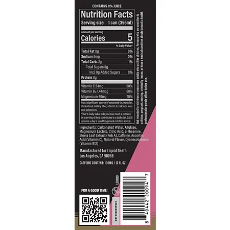 Carbonated water, allulose, magnesium lactate, citric acid, l-theanine, stevia leaf extract (reb a), caffeine, ascorbic acid (vitamin c), natural flavor, cyanocobalamin (vitamin b12).