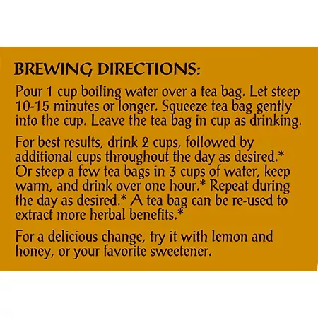 For best results, enjoy 2 cups initially, followed by additional cups throughout the day as desired.* Alternatively, steep several tea bags in 3 cups of water, keep warm, and sip over the course of one hour.* This process may be repeated 2–4 times daily as desired.*