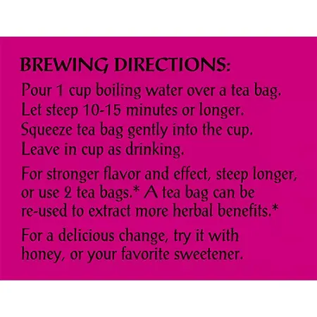Brewing directions: Pour 1 cup of boiling water over 1 tea bag. Cover and let steep for 10–15 minutes or longer for a stronger flavor. Gently squeeze the tea bag into the cup and leave it in while drinking. For a more robust brew, use 2 tea bags or steep longer.* A tea bag may be reused to extract additional herbal benefits.* Enjoy plain or with honey or your preferred sweetener.